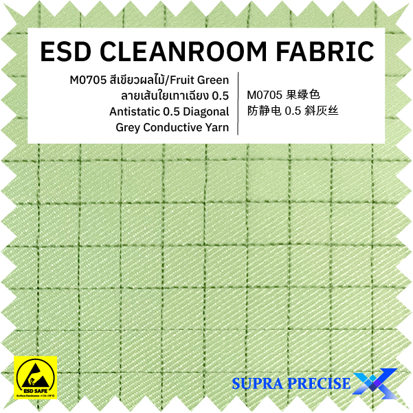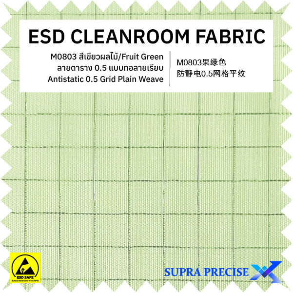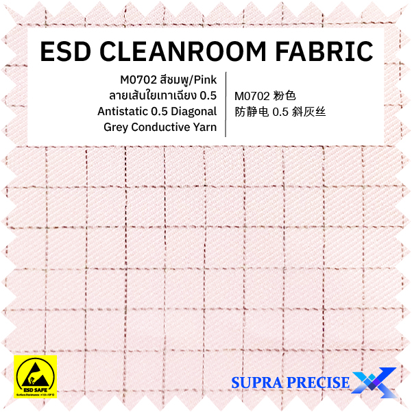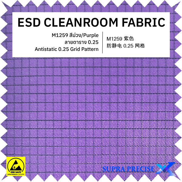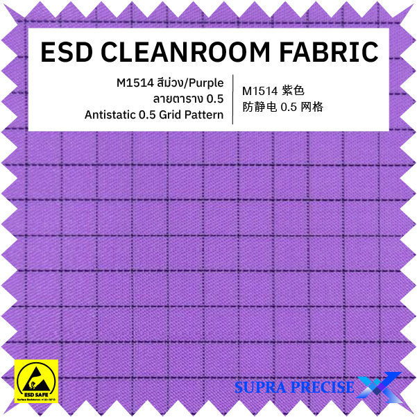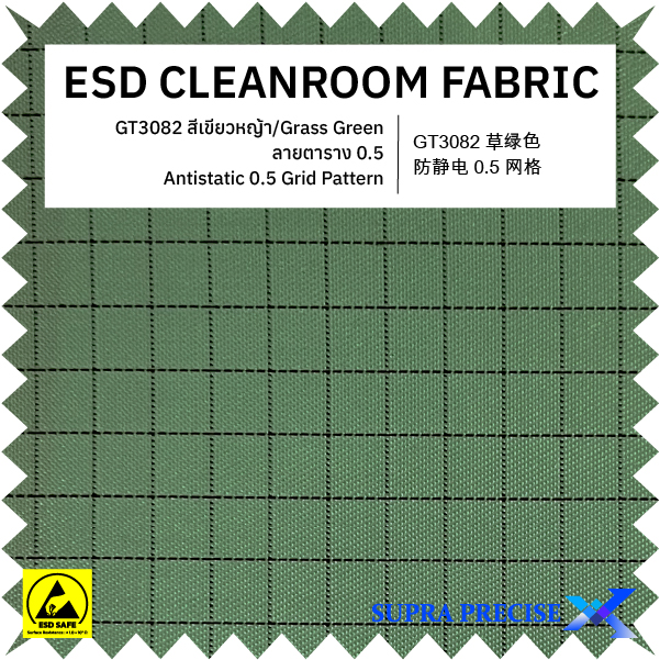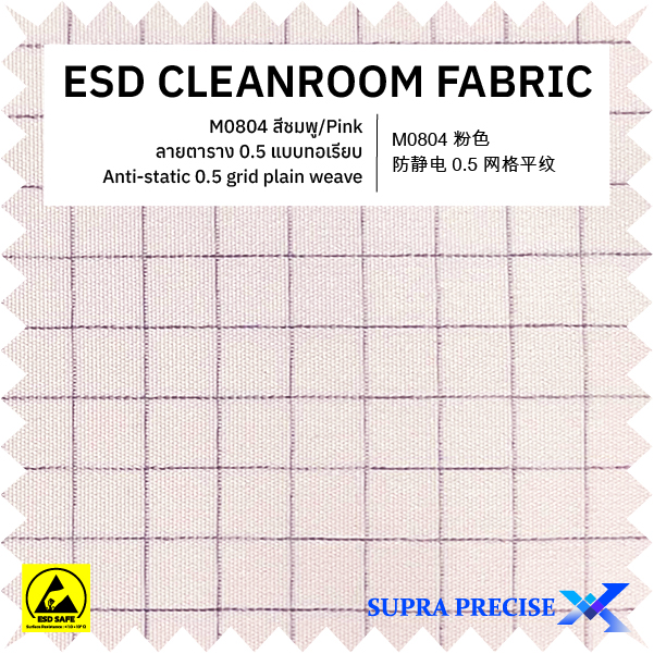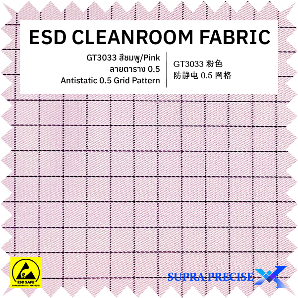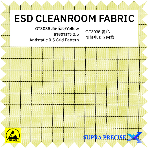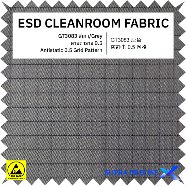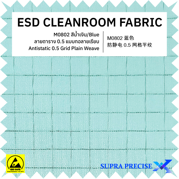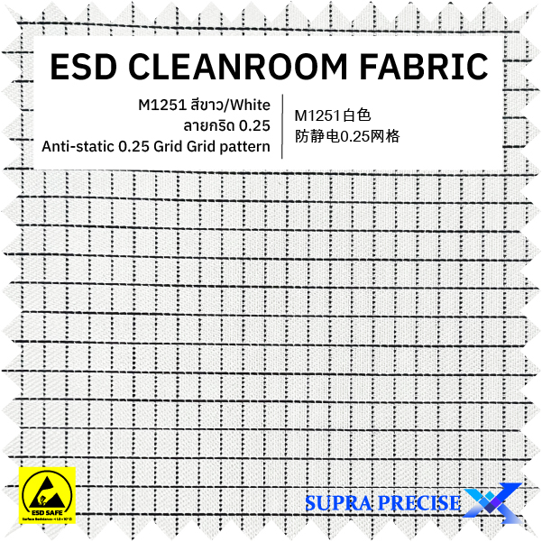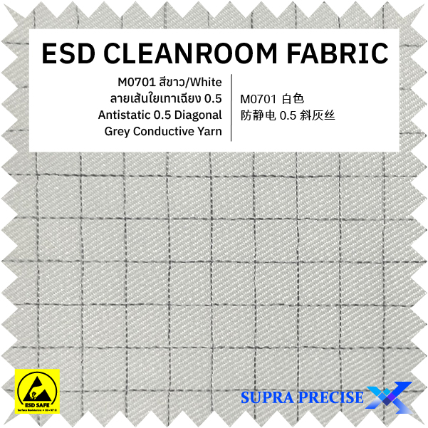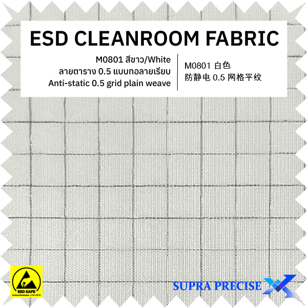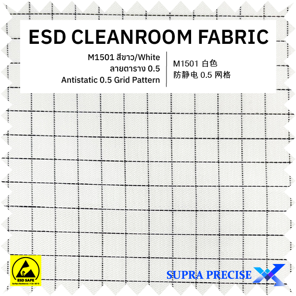 โครงสร้างทอแบบ Plain Weave ให้ความแข็งแรงสม่ำเสมอ พร้อมเส้นใยนำไฟฟ้าลายกริด 0.5 ซม. สำหรับควบคุมไฟฟ้าสถิตในคลีนรูม