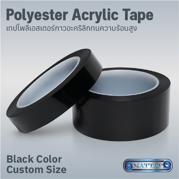 Black Polyester Acrylic Tape คือเทป PET สีดำเคลือบกาวอะคริลิกคุณภาพสูง ให้แรงยึดติดดีเยี่ยม คงรูปดี ทนร้อน ทนชื้น และทนสารเคมี เหมาะสำหรับงานที่ต้องการเทปสีดำที่ทนทานและยึดติดได้ดีบนหลายพื้นผิว เช่น อิเล็กทรอนิกส์ พลาสติก โลหะ อุปกรณ์ไฟฟ้า และงาน OEM สีดำช่วยให้มองหาจุดติดหรือการวางเทปได้ง่ายขึ้น และยังเหมาะกับงานที่ต้องการความเรียบร้อยหรือปกปิดพื้นผิวบางส่วน โดยไม่ทำให้เกิดการสะท้อนแสง