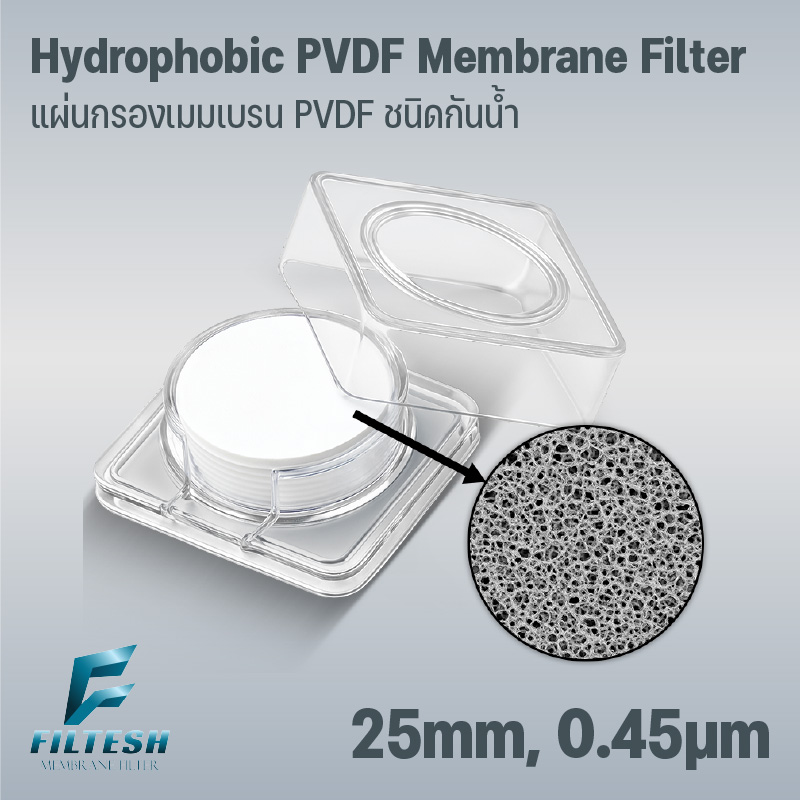 Hydrophobic PVDF Membrane Filter 25mm, 0.45 μm ผลิตจาก Polyvinylidene Fluoride (PVDF) ที่มีคุณสมบัติ hydrophobic เหมาะกับ General Filtration ของ solvent และ gas/air จุดเด่นคือ Low Protein Binding, High Chemical Resistance และ High Flow Rate ขนาดมาตรฐาน 25mm ใช้งานง่ายในห้องแล็บ