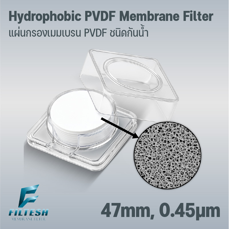 Hydrophobic PVDF Membrane Filter 50mm, 0.22 μm ผลิตจาก Polyvinylidene Fluoride (PVDF) ที่มีผิว hydrophobic เหมาะกับ Sterile Filtration ของ solvent และ gas/air ปริมาณ 500–1000 ml จุดเด่นคือ Low Protein Binding ลดการสูญเสียสารชีวภาพ และมีความทนทานต่อสารเคมีสูง