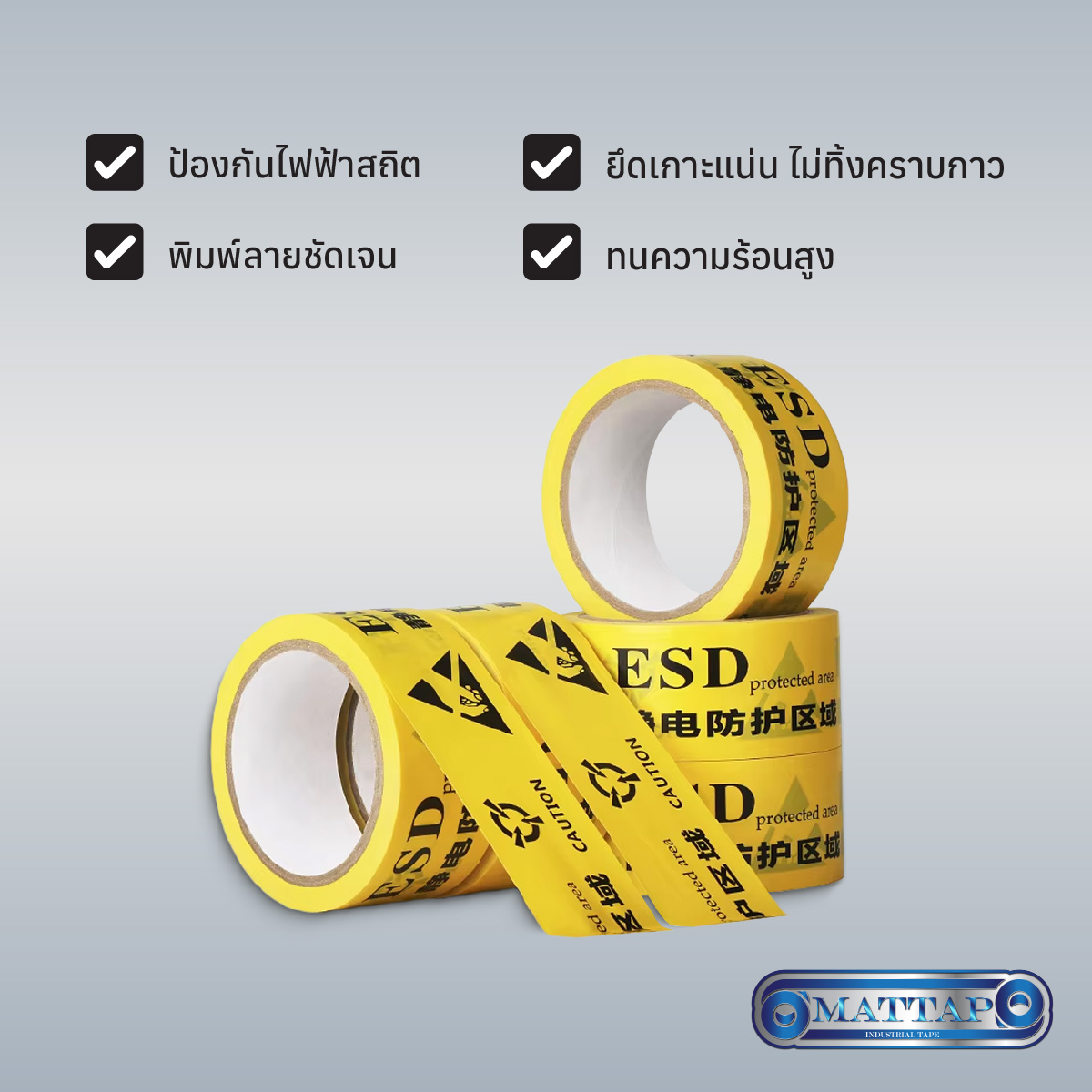 Printed Anti Static Tape (ESD Caution) คือเทปกาวที่ออกแบบมาเพื่อใช้ในงาน ควบคุมไฟฟ้าสถิต (ESD Control) ผลิตจาก ฟิล์มโพลีเอสเตอร์ (PET Film) หรือ โพลีโพรพิลีน (OPP Film) เคลือบด้วย กาวอะคริลิกชนิดป้องกันไฟฟ้าสถิต (Anti-static Acrylic Adhesive) พร้อม พิมพ์ข้อความเตือน “ESD Caution”, “Static Sensitive Devices”, “Attention” บนผิวเทป
