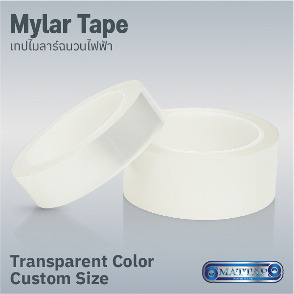 Transparent Mylar Tape คือเทปฉนวนไฟฟ้าที่ผลิตจากฟิล์ม Polyester (PET Mylar Film) แบบโปร่งใสคุณภาพสูง เคลือบด้วยกาวอะคริลิกหรือกาวซิลิโคน ให้ความแข็งแรงสูง คงรูปดี ทนความร้อน และรองรับแรงดันไฟฟ้าสูงได้ยอดเยี่ยม